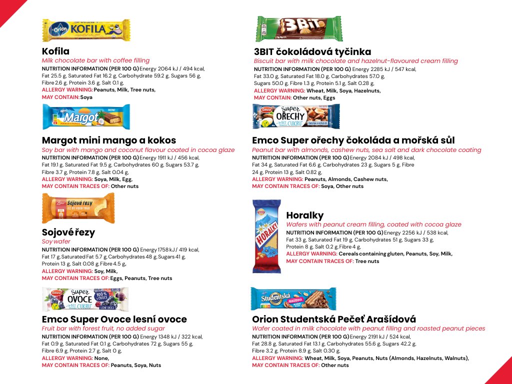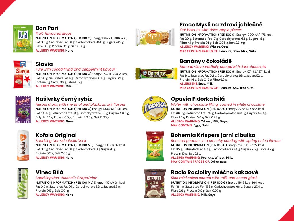 Hartbonbons mit Fruchtgeschmack, natürlich gefärbt mit Frucht und Pflanzenkonzentraten. Klassische tschechische Bonbons mit leuchtenden Farben, klarem Fruchtgeschmack und lang anhaltender Süße, die in jedem Stück nostalgische Erinnerungen wecken.